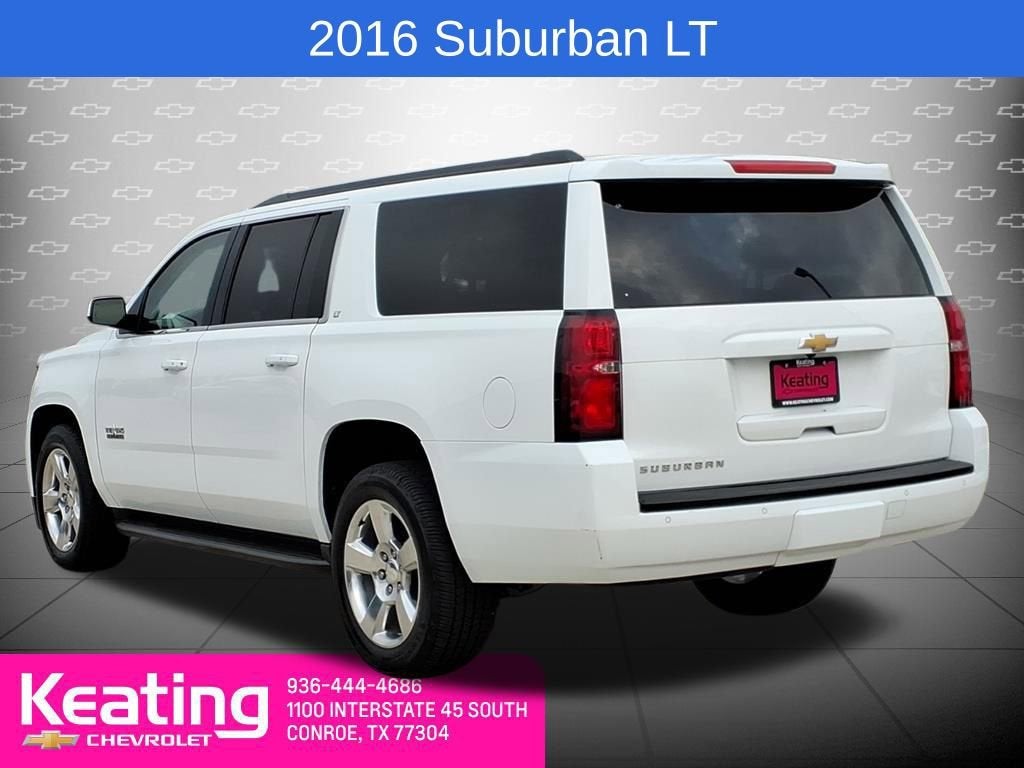 The 2016 Chevrolet Suburban LT 2WD is a full-size SUV that delivers exceptional space, power, and premium comfort, making it an ideal choice for families, road trips, and towing needs. Finished in Summit White with a refined Cocoa and Dune leather interior, this Suburban combines timeless styling with upscale interior appointments. Its bold exterior design is complemented by polished 20-inch aluminum wheels, black assist steps, roof-mounted luggage rack side rails, and IntelliBeam automatic headlamps, giving it a confident and commanding presence on the road.Powered by the proven 5.3L EcoTec3 V8 engine, this Suburban produces strong performance with impressive efficiency thanks to advanced technologies including Direct Injection, Active Fuel Management, and Variable Valve Timing. Paired with an electronic 6-speed automatic transmission and rear-wheel drive, this SUV delivers smooth acceleration and confident towing capability. The Premium Smooth Ride suspension enhances comfort and stability, while the Max Trailering Package and integrated trailer brake controller make it well-equipped for hauling trailers, boats, or recreational equipment.Inside, the Suburban LT offers a spacious and luxurious cabin with leather-appointed seating and room for up to eight passengers. Heated front seats, heated second-row seats, and a heated leather-wrapped steering wheel provide comfort in all conditions. The power-folding third-row seat and power-release second-row seats make it easy to configure the interior for passengers or cargo. Tri-zone automatic climate control ensures personalized comfort for all occupants, while memory settings, power-adjustable pedals, remote start, push-button start, and a hands-free power liftgate add convenience to daily driving.Technology is a highlight with the Chevrolet MyLink infotainment system featuring navigation, Bluetooth® connectivity, HD Radio, SiriusXM capability, wireless charging, and a Bose premium 9-speaker audio system that delivers rich sound throughout the cabin. OnStar with 4G LTE connectivity enhances convenience and safety while keeping passengers connected on the go.Safety features are comprehensive, including Forward Collision Alert, Lane Keep Assist, Lane Departure Warning, Side Blind Zone Alert, Rear Cross-Traffic Alert, front and rear park assist, a Rear Vision Camera, Safety Alert Driver Seat, and StabiliTrak electronic stability control. These advanced safety technologies help provide confidence and protection for both driver and passengers.With its powerful V8 engine, premium interior, advanced safety features, and legendary Suburban capability, this 2016 Chevrolet Suburban LT offers outstanding versatility and comfort for any lifestyle.For more information about this vehicle, visit www.keatingchevrolet.comor call 936-286-4495.