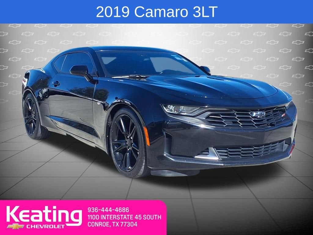 Available at Keating Chevrolet, this 2019 Chevrolet Camaro 3LT delivers a thrilling combination of performance, style, and modern technology. Finished in Black GBA with a Jet Black interior, this Camaro commands attention with its aggressive design and athletic stance.Under the hood, it’s powered by a 3.6L V6 DI engine with VVT, producing 335 horsepower and 284 lb-ft of torque, paired with an 8-speed automatic transmission and rear-wheel drive, providing an exhilarating driving experience. The sport suspension, dual-outlet stainless-steel exhaust, and 3.27 rear axle ratio further enhance its dynamic performance.Inside, the Camaro offers a driver-focused cockpit featuring heated and ventilated front seats, leather-wrapped flat-bottom steering wheel, 8-way power-adjustable driver seat, 6-way power front passenger seat, and dual-zone automatic climate control. Convenience is elevated with a remote vehicle starter system, illuminated sill plates, power sunroof, and decklid-mounted lip spoiler.Technology and entertainment are front and center with the Chevrolet Infotainment 3 Premium system, Bose 9-speaker audio system, 8-inch color driver information center, Bluetooth® phone connectivity, and an available Wi-Fi hotspot.Safety is comprehensive, including forward collision alert, rear park assist, rear cross traffic alert, lane change alert with side blind zone alert, teen driver mode, HD rear vision camera, StabiliTrak stability control, and 10 airbags, providing peace of mind with every drive.Exterior features include 20-inch 5-split-spoke aluminum wheels, LED taillamps, body-color heated power-adjustable mirrors, and all-weather tires, delivering both style and functionality. Optional packages like the RS Package, Convenience and Lighting Package, and Weather Protection Package further enhance the Camaro’s performance, comfort, and utility.Visit Keating Chevrolet to experience the excitement of the 2019 Chevrolet Camaro 3LT in person at www.keatingchevrolet.comor call 936-286-4495.