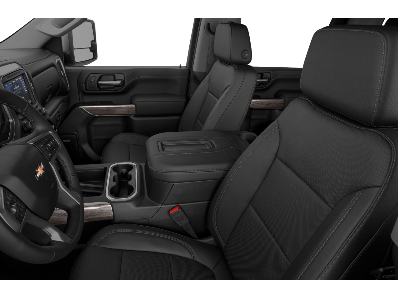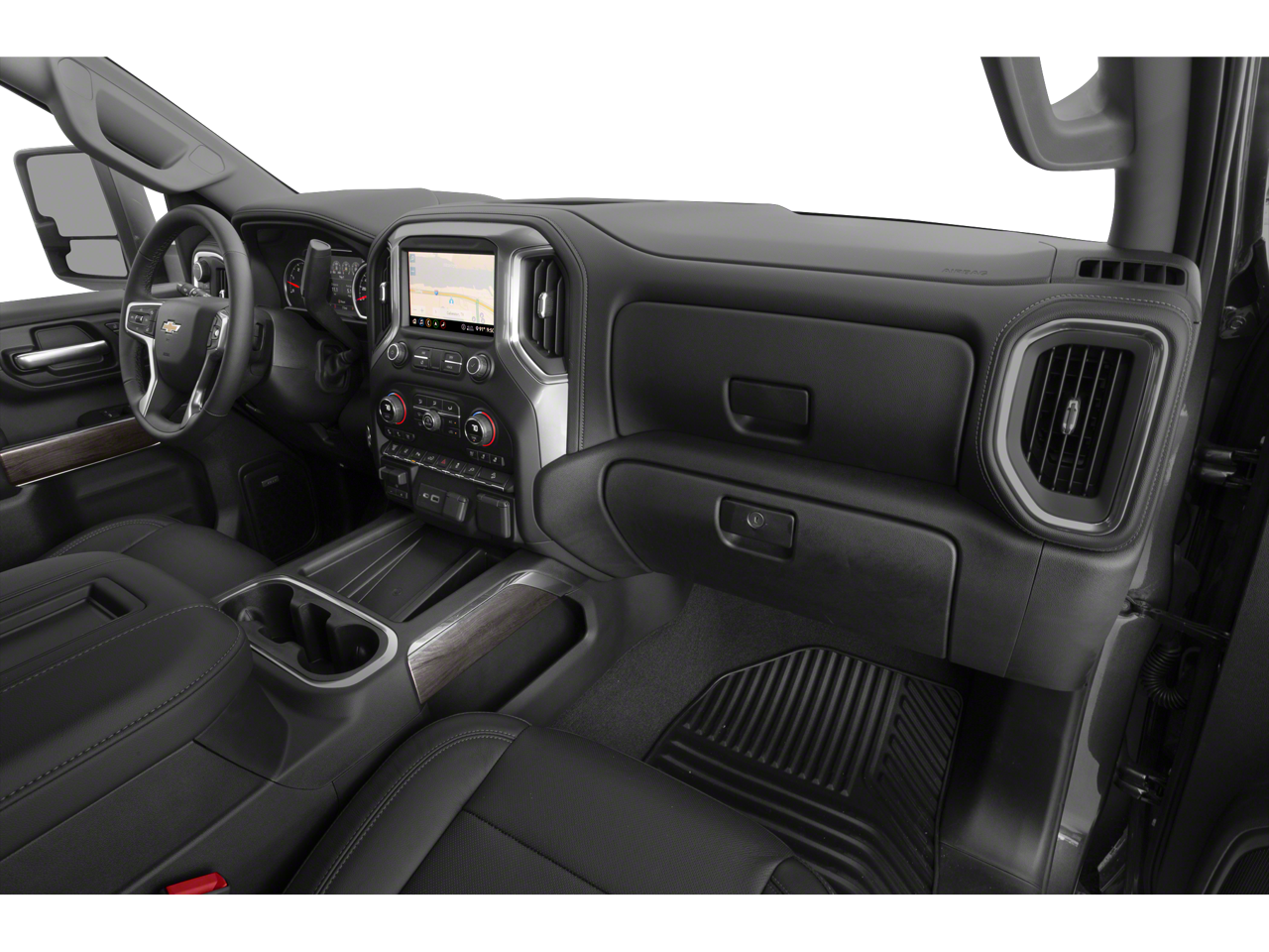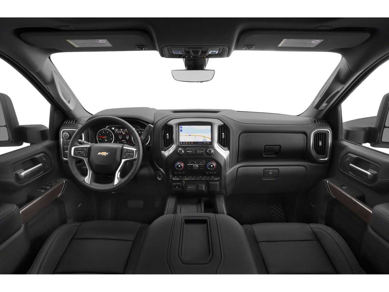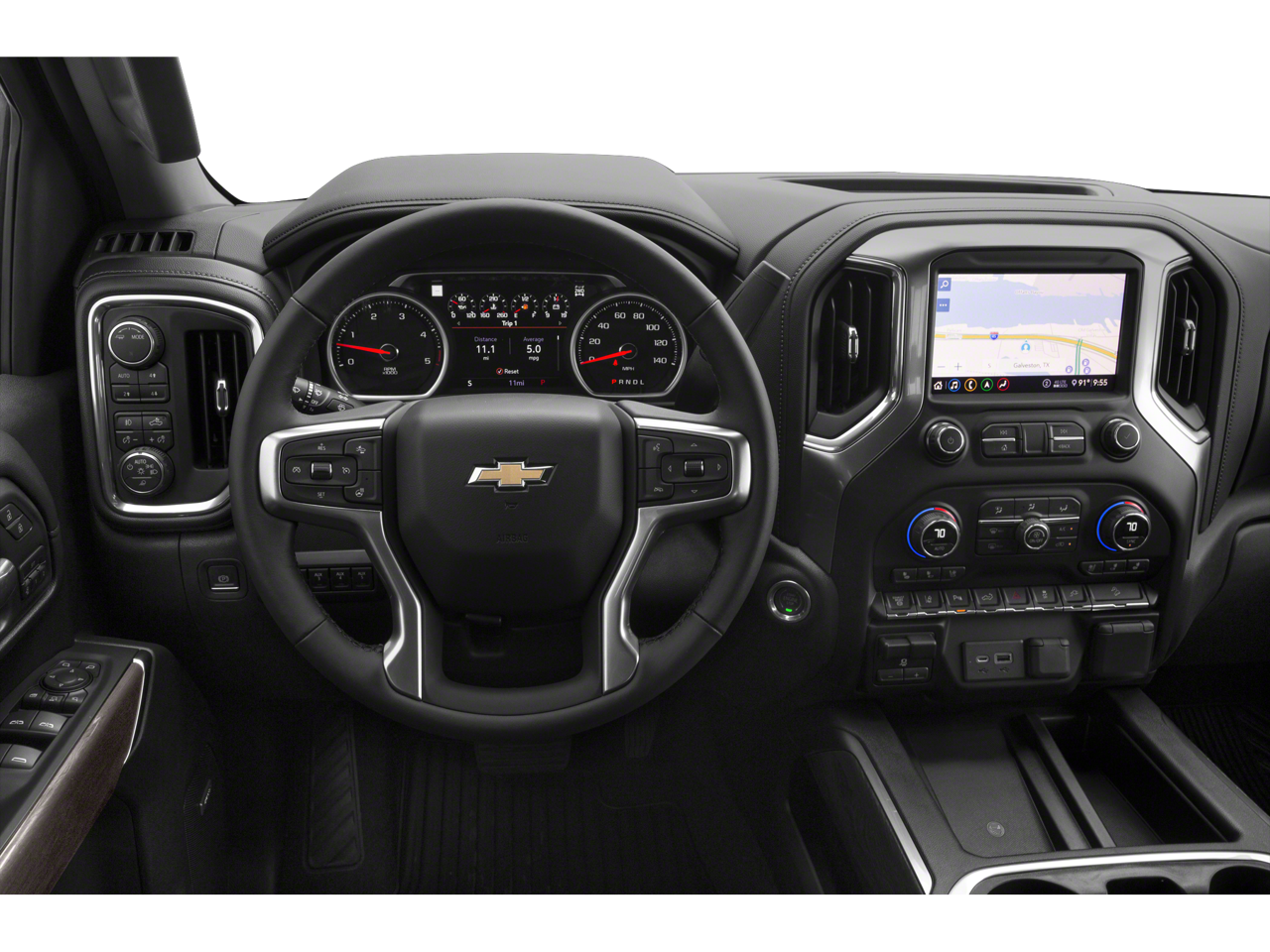 Inside, the Silverado balances rugged strength with upscale comfort. Highlights include dual-zone automatic climate control, heated and ventilated front bucket seats with center console, 10-way power seating, driver seat and mirror memory, and a heated leather-wrapped steering wheel with audio controls. A 60/40 rear folding bench seat with storage adds everyday versatility, while keyless open and start and remote start provide added convenience.