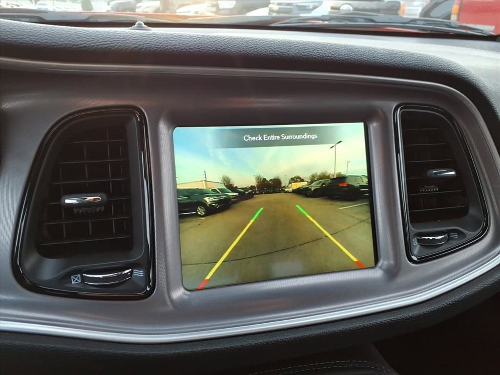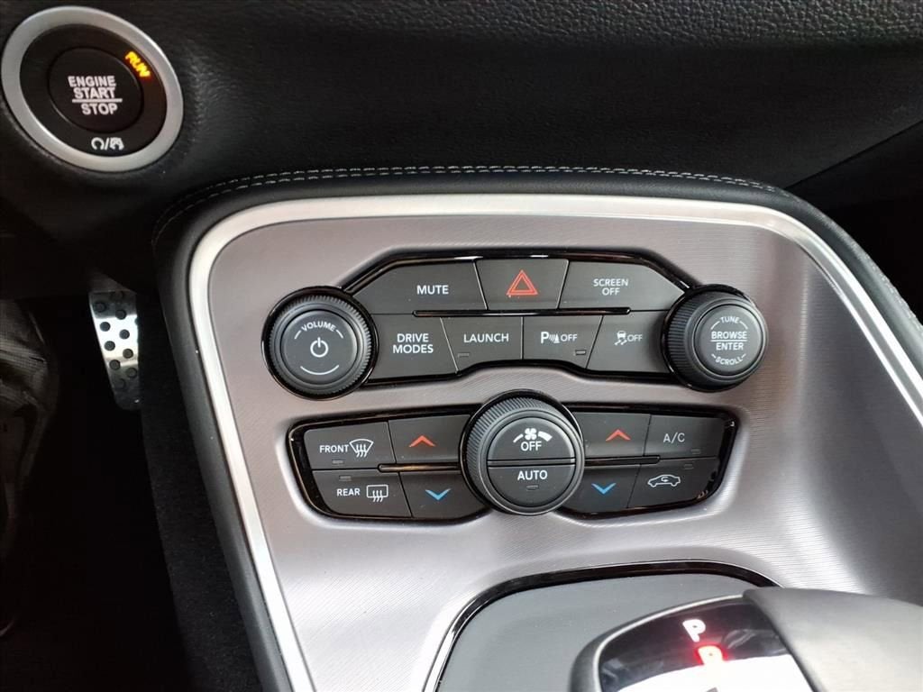 Inside, the cabin blends muscle car heritage with modern comfort and technology. Houndstooth cloth performance seats with Scat Pack logo, heated front seats, heated steering wheel, dual-zone automatic climate control, power driver seat with lumbar support, and a flat-bottom steering wheel create a driver-focused environment. The 180-MPH performance speedometer, SRT® Performance Pages, and performance shift indicator keep vital performance data front and center.