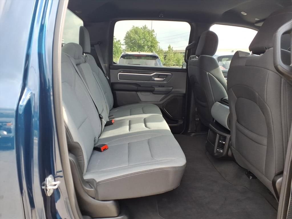 The 2022 RAM 1500 Lone Star Crew Cab 4x4 is a full-size pickup designed for capability and comfort. It features a Patriot Blue Pearl–Coat exterior with a Black/Diesel Gray interior and cloth bench seating. Power comes from a 5.7L V8 HEMI® MDS VVT eTorque engine with Stop/Start technology, paired with an 8-speed automatic 8HP75 transmission.
