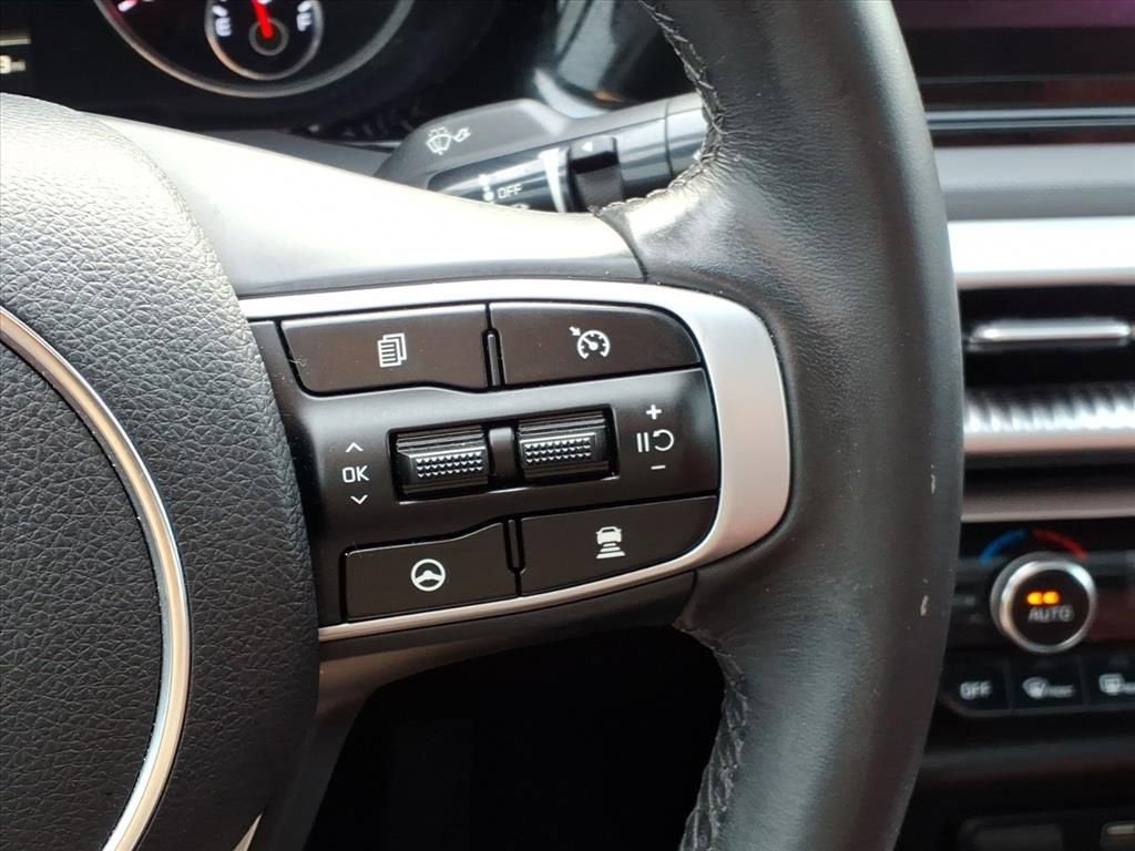 The GT-Line trim enhances the K5’s athletic presence with 18-inch gloss black machined alloy wheels, LED projection headlights, LED brakelights, a metal-look grille, fog lamps, and subtle sport accents including a rear lip spoiler. Automatic high beams, perimeter lighting, and power heated side mirrors with turn signal indicators add both convenience and visibility.