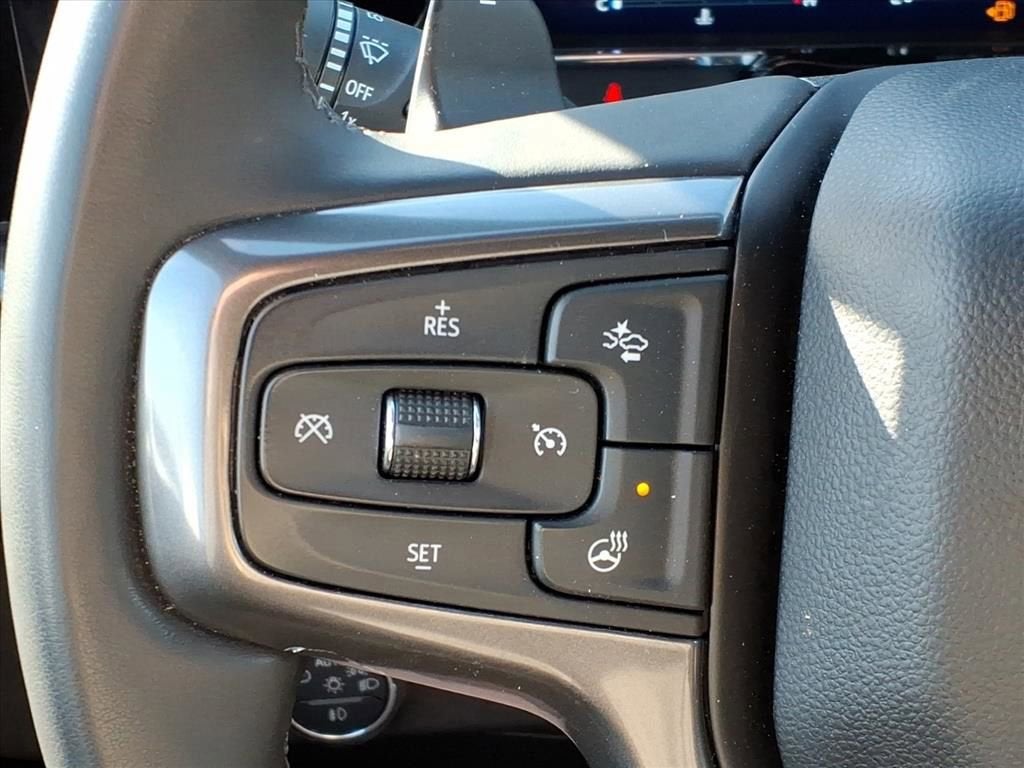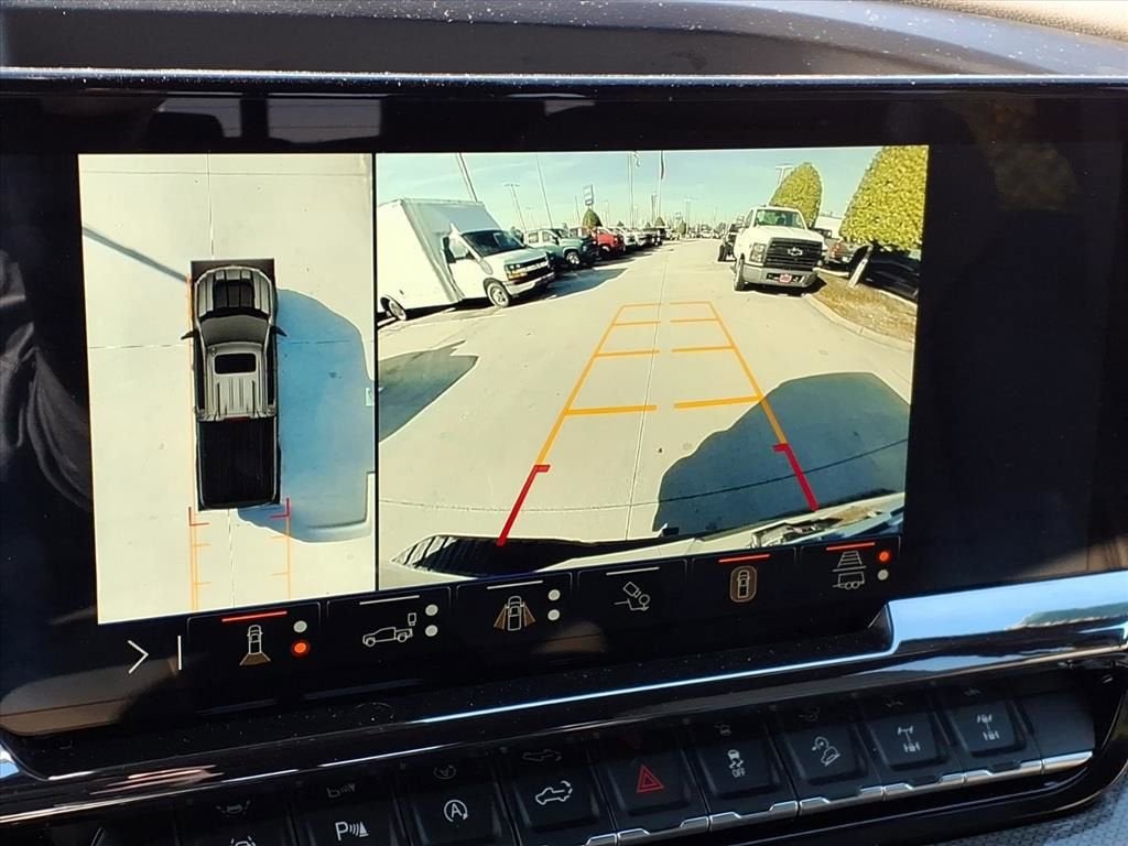 This Silverado is equipped with the Technology Package, adding a rear camera mirror, multicolor 15-inch head-up display, adaptive cruise control, and a power rake and telescoping steering column. Additional features include a power sunroof, Multi-Flex tailgate, Kicker Multi-Flex tailgate audio system, off-road high-clearance steps, active exhaust, and the Dark Appearance Package with black badging, recovery hooks, and 18-inch gloss black wheels.